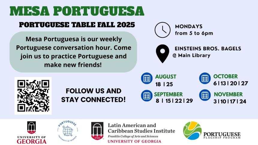 "The Portuguese Table is not only a place to go to improve your Portuguese, but it is also a place to make friends and learn about the many activities organized by Brazilian students on campus. Conversation is casual, but we also have games and activities to prompt conversation. The Portuguese table is also a nice place to get tips about places in Georgia where you can experience a little bit of Brazilian culture and food. We are always around and willing to meet new people." - Daniel